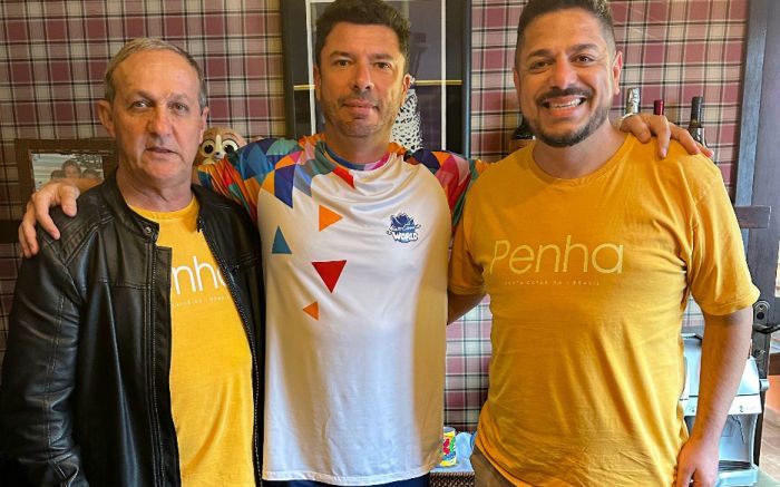 Os candidatos a prefeito e vice do PL de Penha, Luizinho Américo e Mário Marquett (UB), com o presidente do parque Beto Carrero, Alex Murad