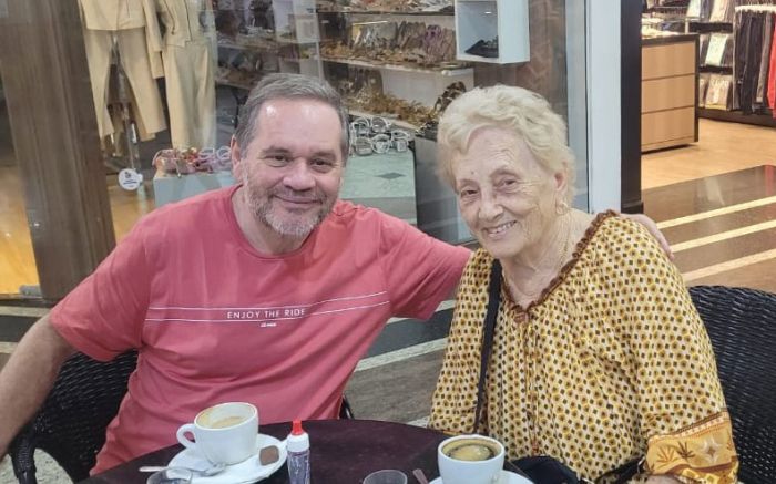 Bebericando um café com a leitora do DIARINHO em BC, a querida Valentina, que aos 92 anos transborda alegria, toca acordeon e joga bocha. Só posso agradecer o prazer da companhia
