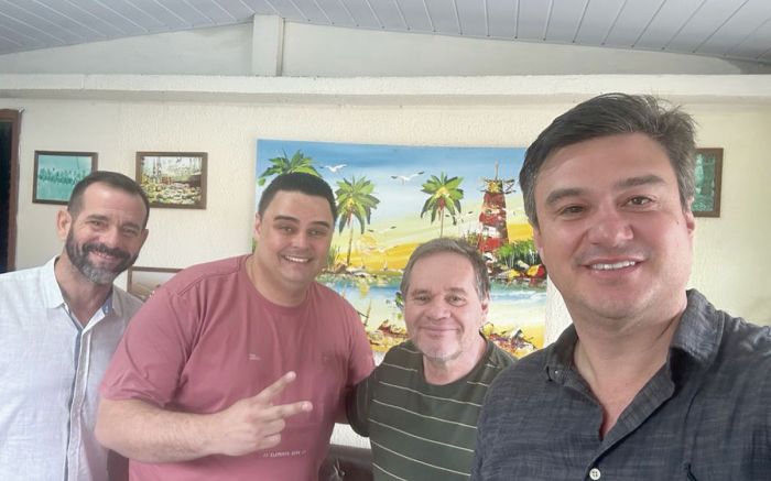 O presidente do Camboriú Futebol Clube, Renato Cruz (pré-candidato a prefeito); vereadores Ewerson Umbelino/PL (pré-candidato a prefeito) e Marcio Pereira (PSD) fizeram uma visita de cortesia ao socadinho escriba