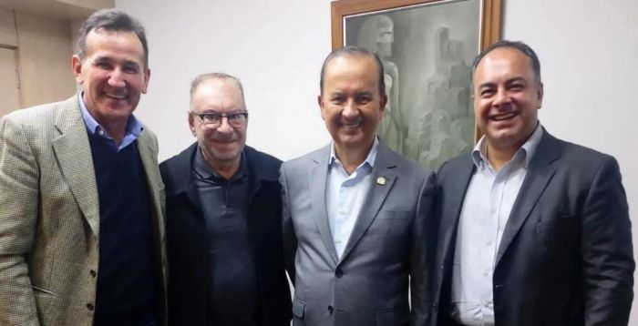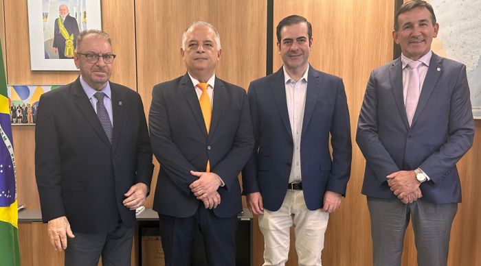 O prefeito barbudinho de Itajaí, Volnei Morastoni, o ministro dos Portos e Aeroportos, Márcio França, e os deputados federais catarinenses Carlos Chiodini (MDB) e Jorge Goetten (PL), em Brasília