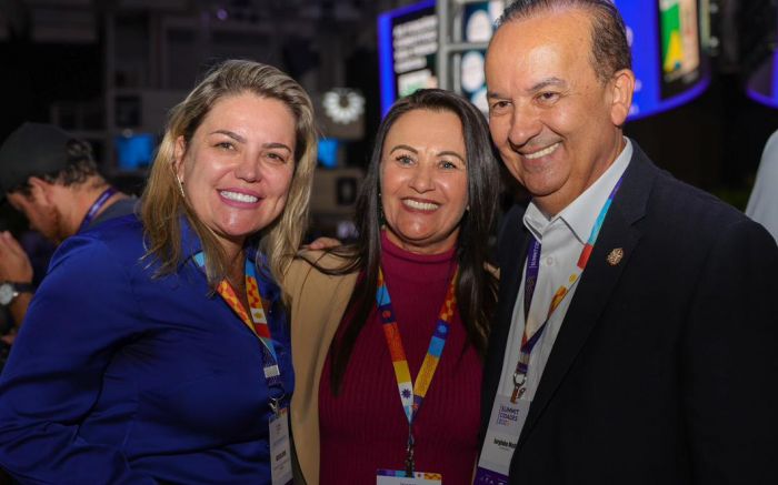 A vice-prefeita de Penha, professora Juraci (MDB, por enquanto), o governador Jorginho Mello (PL) e a presidente da Fecam, Milena Lopes (PL)