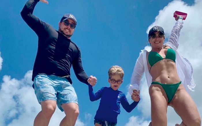 Família nas alturas, bem no momento do pulo: Lucas, Benjamin e Keity Bellini Morastoni