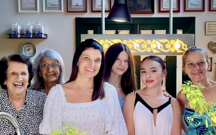 A bisa Iraci Sodré, a nora Ângela S. da Silva, as netas Paula e Maria e as bisnetas Clara e Helô, bem naquela tradicional foto da “janela”, no after party. Salve simpatias!