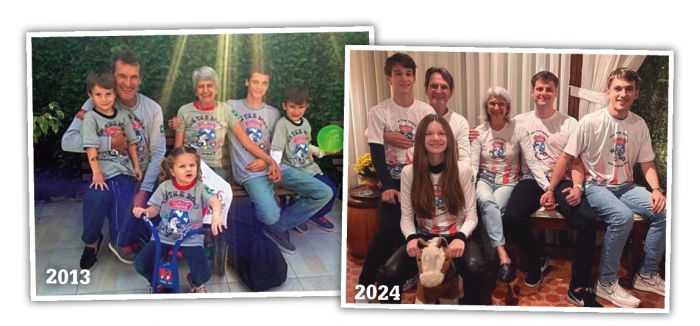 Dolor Silva e Ângela, lá em 2013, quando aconteceu a primeira trip com os netos: Mateus, Clara, Pedro e João, e na última terça, dia 9, antes do embarque da “On the road with Grandpa”