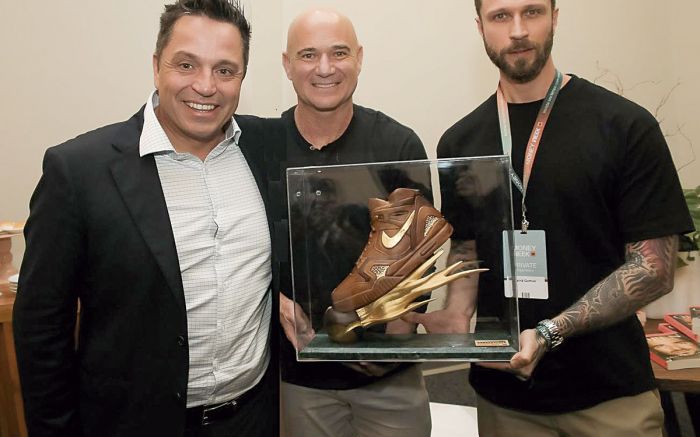 Juliano Custódio, head da EQI Investimentos, Andre Agassi. ex-tenista número 1 do mundo e o artista Cainã Gartner, que homenageou o atleta durante evento em BC.