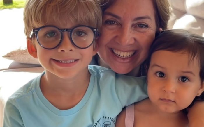 A feliz vovó Nausicaa Morastoni bem abraçadinha com os netos, Benjamin e Maria Antônia. Bem que ela faz!