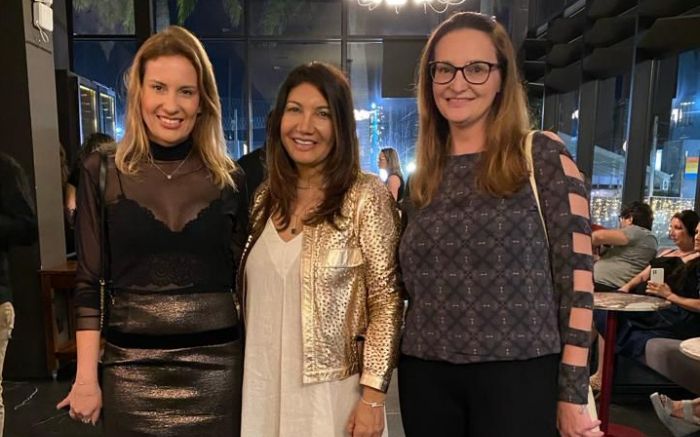 As jornalistas Samara Toth Vieira e Franciele Marcon, com a anfitriã do Brava Mall, Miriam Pinheiro, quarta-feira, na comemoração de um ano do Cristofori Piano Bar
