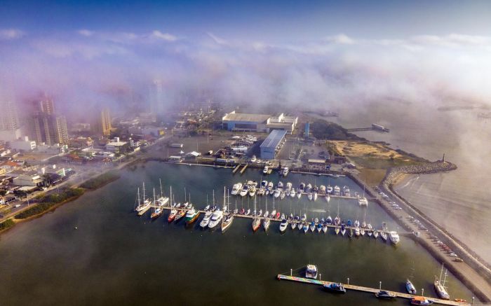 A névoa da manhã transformou a marina e o centroeventos em um cenário quase etéreo, como se flutuassem entre dois mundos. Os barcos surgem e desaparecem na névoa, criando uma dança silenciosa sobre as águas calmas. É Itajaí