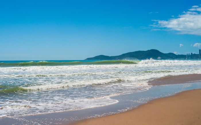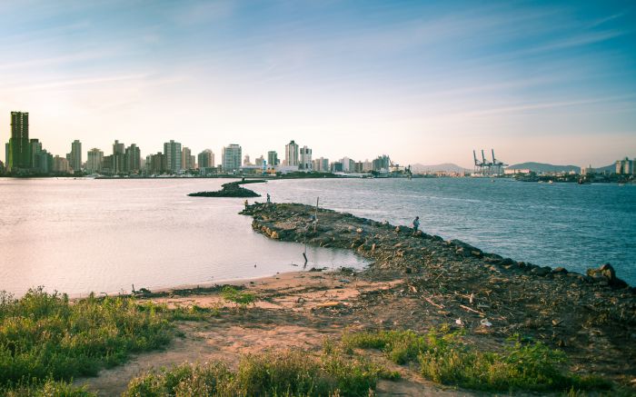 Meia Praia se estende como um suspiro longo, entre prédios, montanhas e o mar calmo.