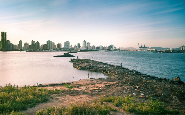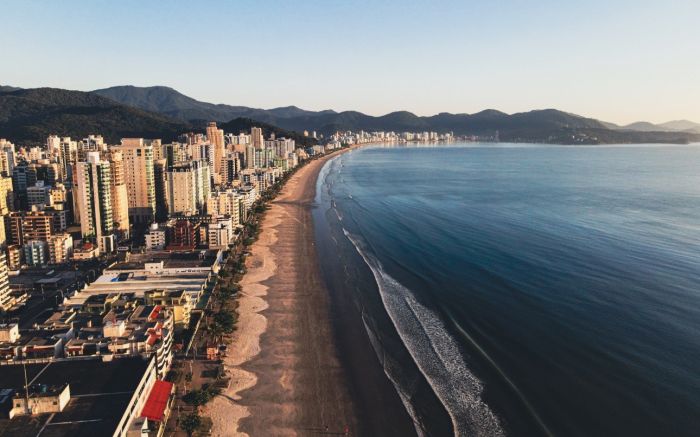 Itajaí e Navegantes se encontram no horizonte. Do alto, tudo vira silêncio, forma e luz. O drone revela o desenho vivo do litoral