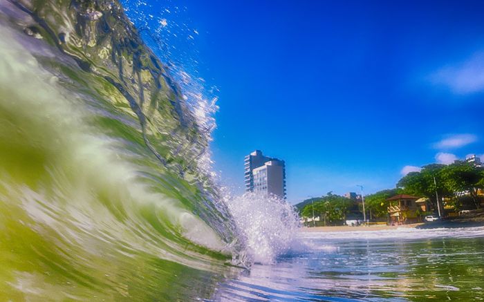 A força e a delicadeza da água em movimento. Uma onda se forma e revela sua beleza na Praia do Atalaia. O mar também sabe ser arte