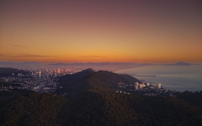 Morro da Cruz revela a cidade em silêncio dourado. O pôr do sol dissolve prédios em poesia. Itajaí respirando luz antes da noite
