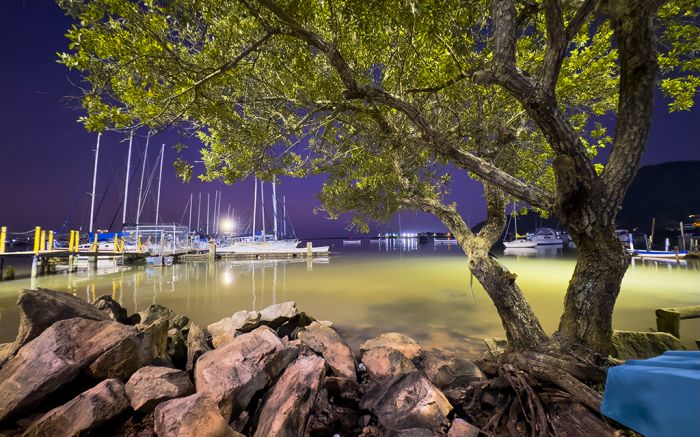 A Baía Afonso Wíppel repousa sob luz suave e água espelhada. Barcos dormem, árvores vigiam. A cidade respira em silêncio