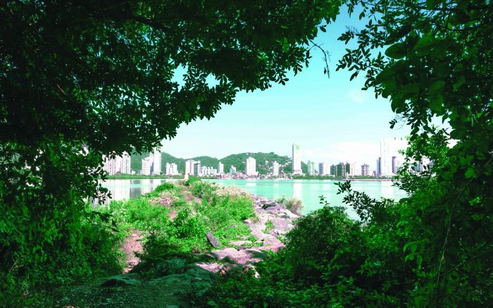 Baía Afonso Wippel, com a vista ao fundo de Itajaí, na moldura natural dos Molhes