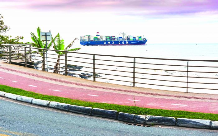 Navio cargueiro saindo do complexo portuário de Itajaí rumo ao seu destino
