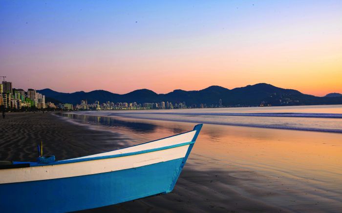 Barquinho na Meia Praia em um lindo amanhecer