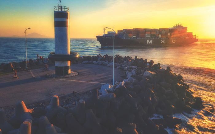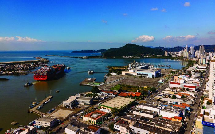 Navio cargueiro saindo do complexo portuário de Itajaí