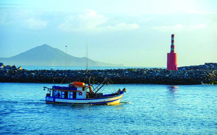 Barco pesqueiro indo em busca de mais um dia de desafio. Imagem do rio Itajaí-Açu