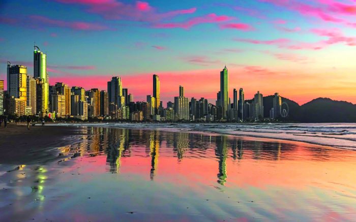 Amanhecer colorido, na Praia Central, em Balneário Camboriú