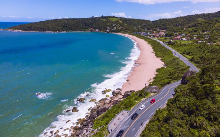 A praia de Taquaras, em Balneário Camboriú, com seu mar azul intenso e a Interpraias serpenteando pela encosta.