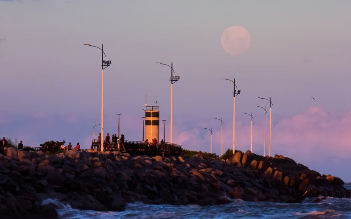A lua cheia subiu redonda sobre o molhe do Atalaia, tingindo o mar de rosa e azul como se fosse pintura. O farol ficou ali, imóvel, guardando o momento. A paisagem inteira parecia prender a respiração