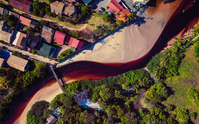 O rio Vermelho serpenteia pela areia antes de tocar o mar, como se desenhasse seu próprio destino. Do alto, a paisagem vira pintura viva em tons quentes. Florianópolis sempre sabe surpreender quem a observa de cima