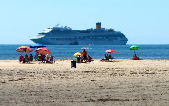 Do estacionamento da praia do Atalaia, o navio surge enquadrado por uma moldura natural de verde e céu dramático.