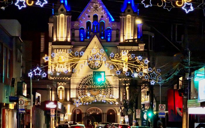 A rua Tijucas brilhou como um rio de luz, e eu, da mesa da lanchonete, virei testemunha do encanto. A Matriz reluzia entre estrelas e neon, transformando a noite de Itajaí em puro espetáculo