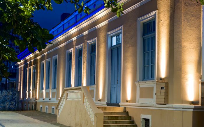A Casa da Cultura brilha suave sob o céu azul profundo. A natureza abraça o prédio histórico com delicadeza. Cada luz acesa parece despertar memórias adormecidas
