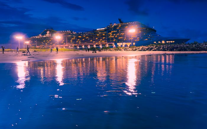 Festa de luzes na saída da barra. O imponente navio de cruzeiro deixa Itajaí, colorindo a noite e refletindo nas águas próximas ao molhe