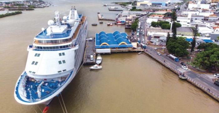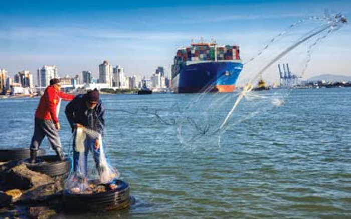 Alfabile Santana flagrou um navio saindo do complexo portuário de Itajaí e Navegantes enquanto os pescadores lançam as suas tarrafas. A foto foi feita a partir do molhe da Barra, com um celular Samsung Galaxy S9 Plus