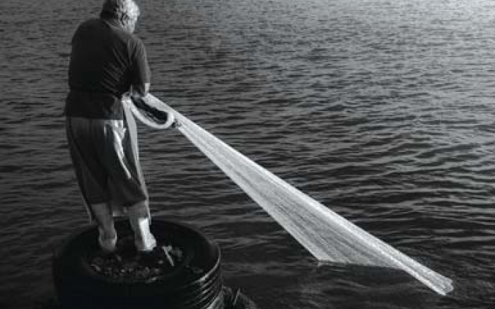 Pescador Marcos puxando a tarrafa no rio Itajaí Açu, Molhe da Barra. Registro em 3 de abril de 2019 através da câmera de celular Samsung Galaxyy S9