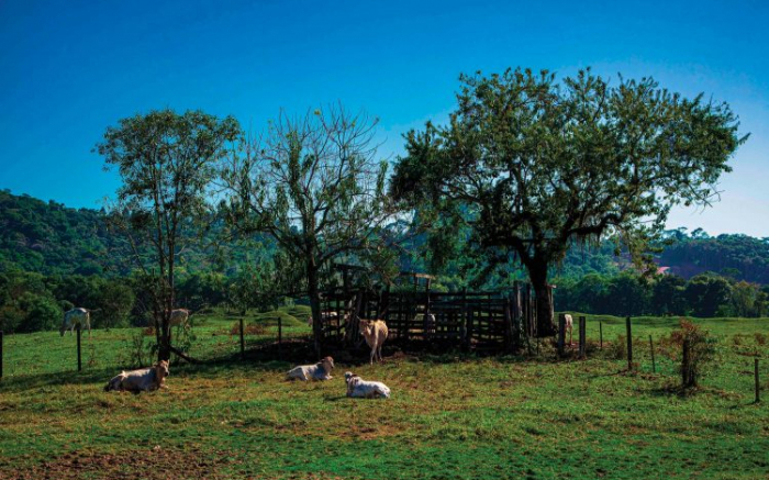 Registro do dia 8/5/2020 às 10h40. Câmera Nikon D810 + Lente Nikkor 24-120. Bois e vacas descansando aos pés de algumas árvores em alguma fazenda no bairro Limoeiro de Itajaí