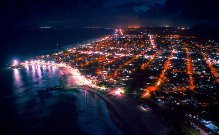 Aqui é uma vista noturna parcial desta que é uma das praias mais extensas do litoral do Paraná