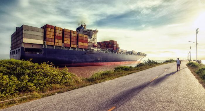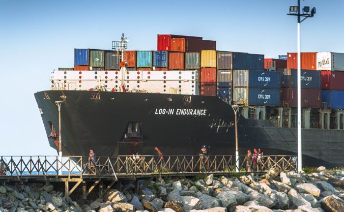 Navio saindo do complexo portuário de Itajaí em uma manhã de sol. Cena que encanta sempre quem a contempla