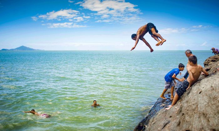 A Praia de Cabeçudas, além de maravilhosa para passar o dia com a família e os amigos, é palco de muita diversão, assim como as pessoas que se arriscam pulando da pedra central. Muitos corajosos se arriscam e proporcionam registros como este da foto ...