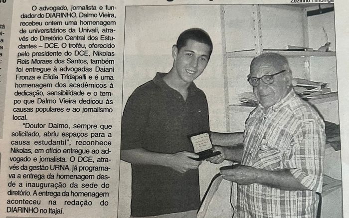 Relembrar é viver! O saudoso véio Dalmo Vieira, fundador do DIARINHO, sendo homenageado pelo futebolista Níkolas Reis