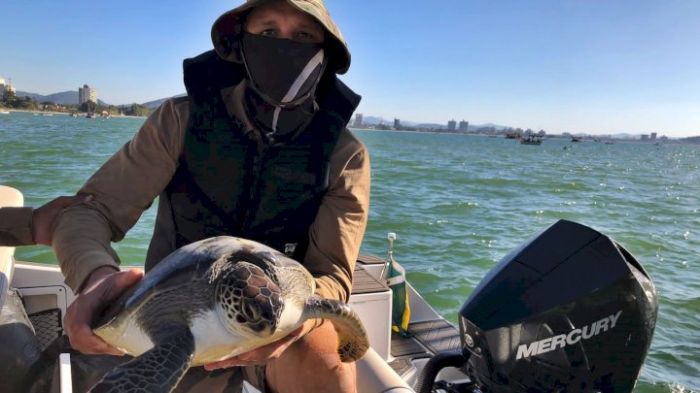 Os animais foram entregues ao Projeto de Monitoramento de Praias, na unidade de Penha, para serem avaliados e depois soltos no mar.