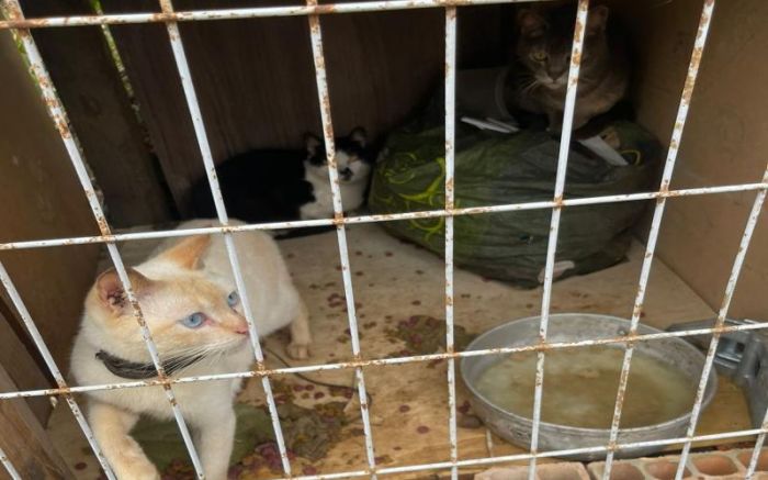 Segundo o Inis, os cães estavam amarrados sob a chuva e a maioria não tinha casinhas, enquanto os gatos estavam trancados em jaulas cheias de fezes.