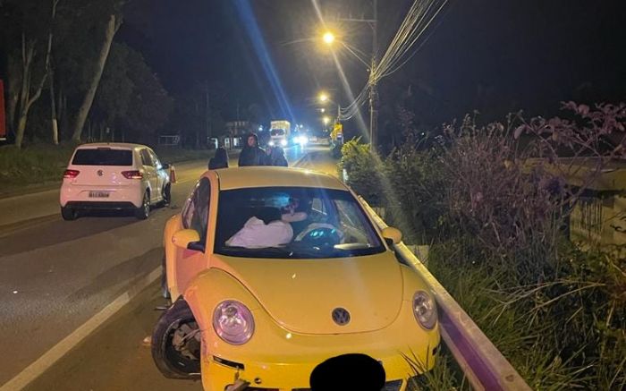 O motorista de um Beetle pegou a direção após beber e provocou um acidente de trânsito na rodovia Jorge Lacerda, na noite de domingo, no bairro Espinheiros, em Itajaí. Ele invadiu a pista contrária e bateu de frente com um Fox. O condutor do Beetle foi preso em flagrante.