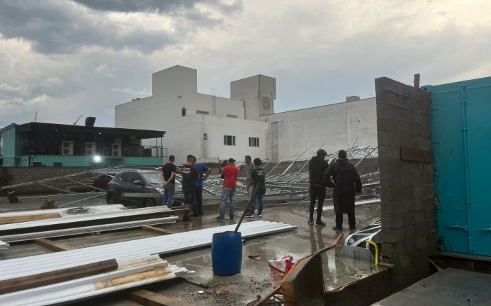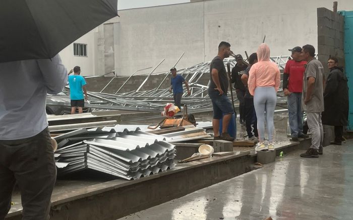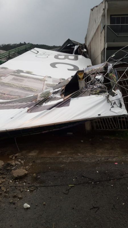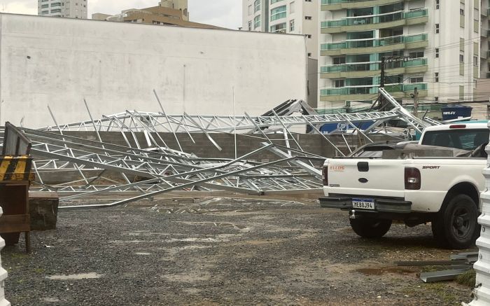 O temporal e a ventania que atingiram Itajaí por volta das 16h de segunda-feira derrubaram placas, estruturas metálicas e pegaram muita gente de surpresa. Na rua Laura Muller, no centro de Itajaí, as rajadas derrubaram parte da estrutura da Arena Beira-Rio, causando prejuízos e adiando a inauguração do local que vai ter quadras de esportes.