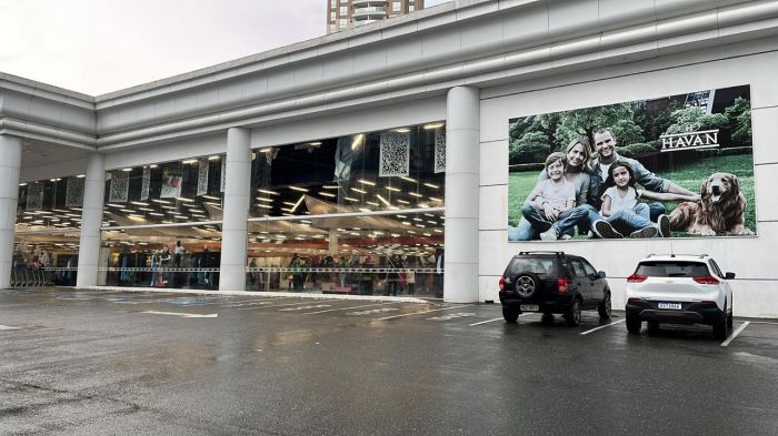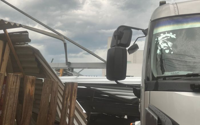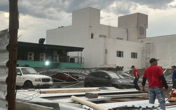 Vendaval derruba estrutura de metal sobre estacionamento