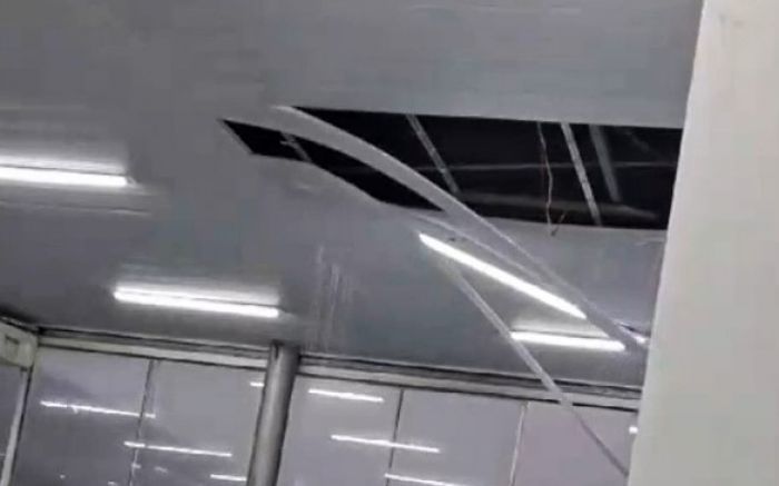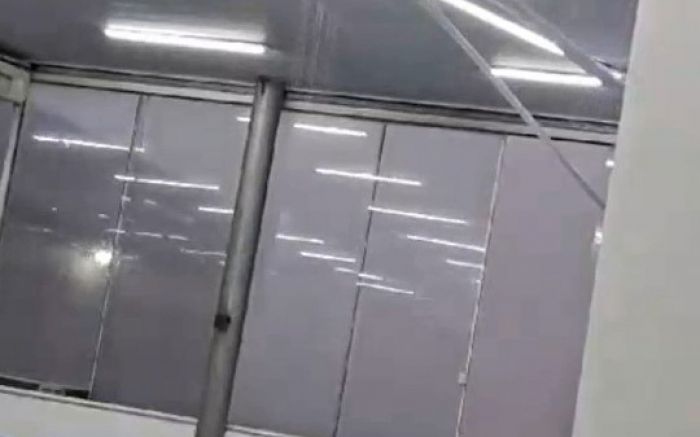 Nas imagens que circulam nas redes sociais é possível ver uma grande quantidade de água caindo do teto. Algumas placas de PVC, que fazem parte do forro, cederam e deixaram um buracão no teto, fazendo com que chovesse dentro da sala.