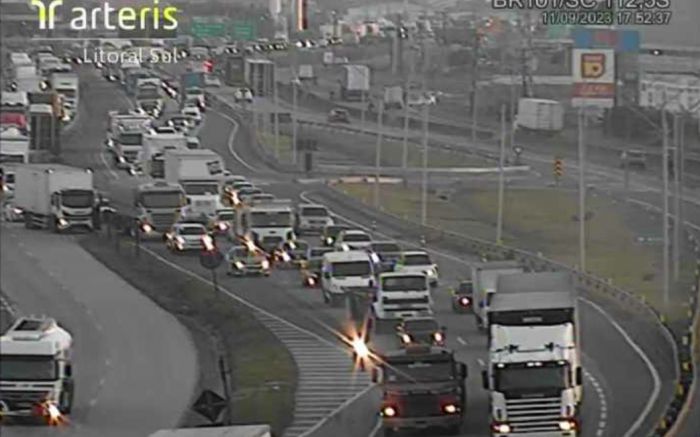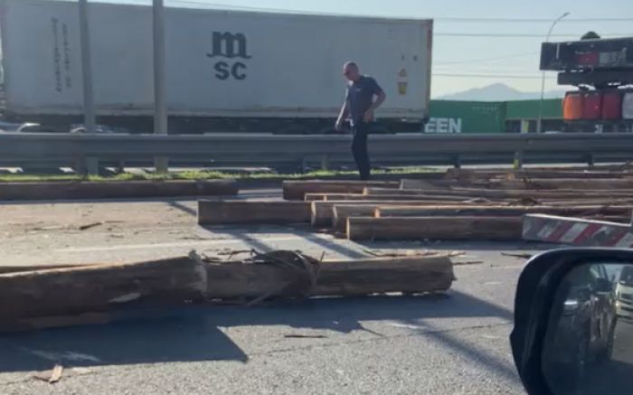 O tombamento de um caminhão no quilômetro 113 da BR 101, às 16h30 de segunda-feira, causou mais de 10 quilômetros de congestionamento no trecho de Itajaí. Parte da carga de toras de madeira chegou a cair do veículo, mas não atingiu ninguém.