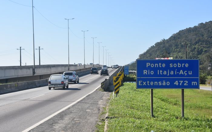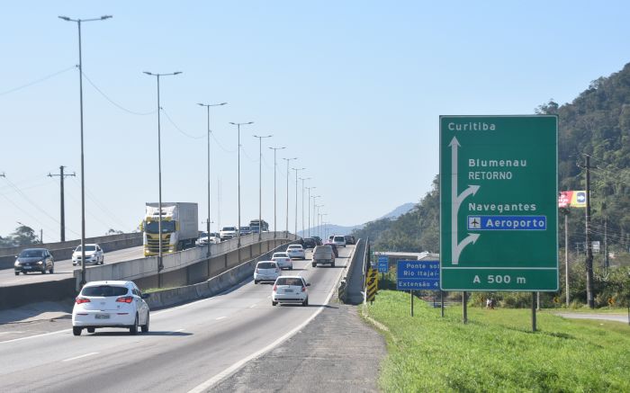 O trecho do acostamento da BR 101 em Navegantes, entre o km 111 e o km 112, segue liberado para passagem de veículos de forma definitiva. A faixa improvisada, de cerca de 700 metros, está sinalizada e permite o trânsito de carros das 6h às 23h. A medida tem o objetivo de desafogar o trânsito na área que dá entrada à BR 470, próximo à ponte sobre o rio Itajaí-Açu.