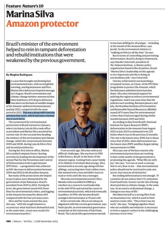 O texto que trata de Marina na Nature aponta como momento marcante dessa “esperança” uma coletiva de imprensa concedida em 3 de agosto, em que ela anunciou que os alertas de desmatamento nos primeiros sete meses do ano tinham caído 43% na comparação com o mesmo período de 2022. “Esta foi uma mudança acentuada em relação aos quatro anos anteriores, que registaram um aumento acentuado neste tipo de alertas”, lembra a publicação.