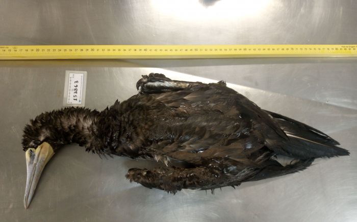 No exame, foi encontrado entre o esôfago e estômago da ave um canudo plástico com quase 19 centímetros de comprimento e pesando cerca de 2,80 gramas. Por conta do material ingerido e da obstrução gástrica, o atobá-pardo, que era uma fêmea juvenil, não conseguiu fazer a absorção dos nutrientes necessários pra sobrevivência e o animal morreu.