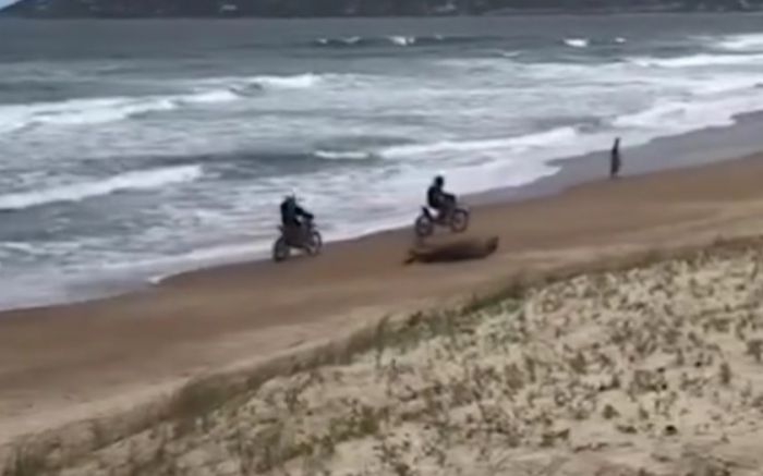 Um vídeo feito pela estudante de biomedicina Milena Lima foi compartilhado na segunda-feira pelo engenheiro ambiental e sanitarista Victor Machado, de Garopaba. As imagens flagraram dois motociclistas “passeando” na praia, desrespeitando a área de isolamento e passando ao lado dos animais.