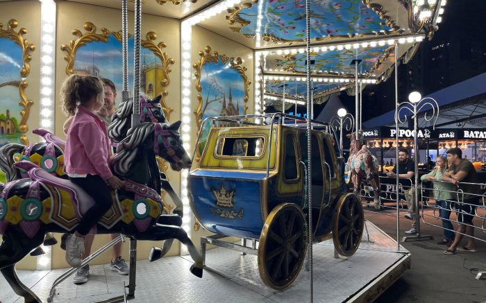 Para as crianças menores, de até 12 anos, o parque indoor pode ser uma boa opção. O espaço fica no pavilhão principal, entre o palco interno e a doceria. A brincadeira custa R$ 50 a hora, mais R$ 10 a cada 15 minutos adicionais.
