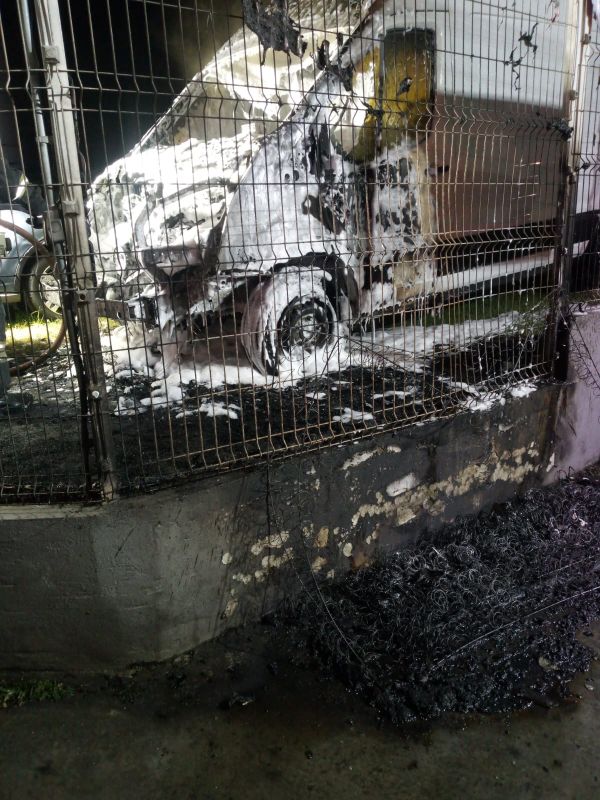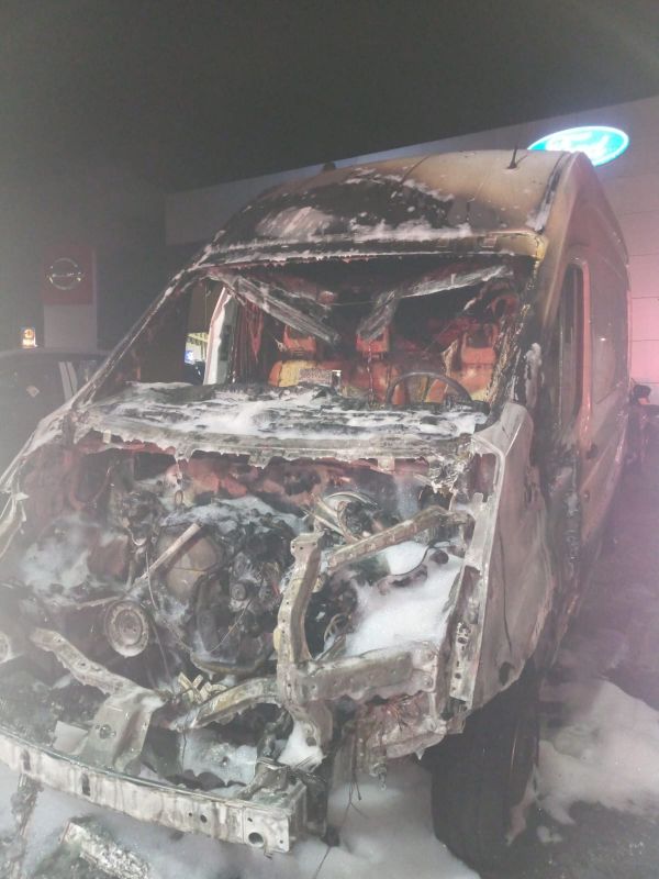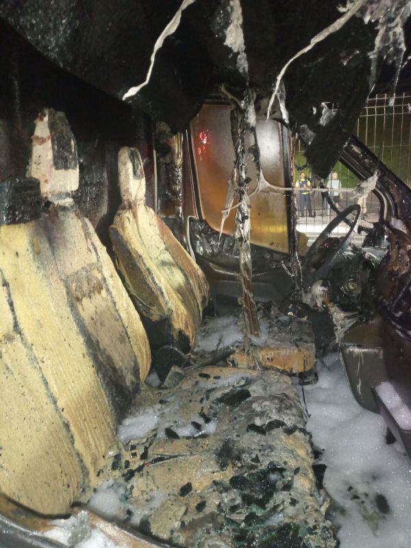 As chamas se alastraram rapidamente, atingindo o Ford Transit estacionado no local. O fogo destruiu o compartimento do motor, a cabine e o rodado dianteiro da van.